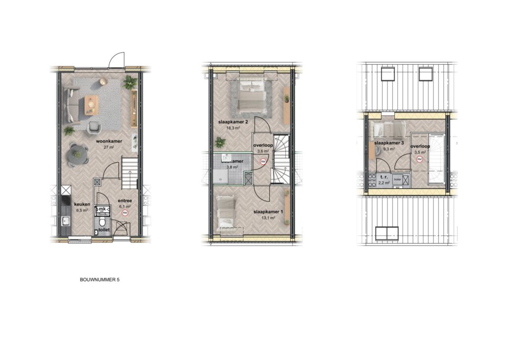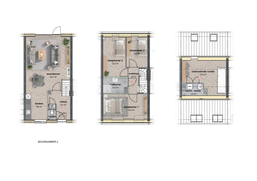 De woningen worden gerealiseerd binnen ons WoonSlim-concept: comfortabel, duurzaam en klaar voor de toekomst. Ze zijn voorzien van een bodemwarmtepomp, warmteterugwinning voor ventilatie en douche, en uitstekende isolatie met onder andere triple glas.